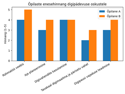 Õpilane B (ülemine tulp) annab kõrgemaid hinnanguid, eriti rühmatöö ja digipausi teadlikkuse osas.